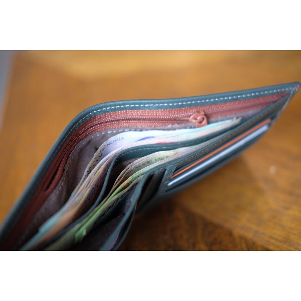 - Ví có 2 ngăn chính để tiền, 1 ngăn khóa kéo, các ngăn thẻ và ngăn phụ